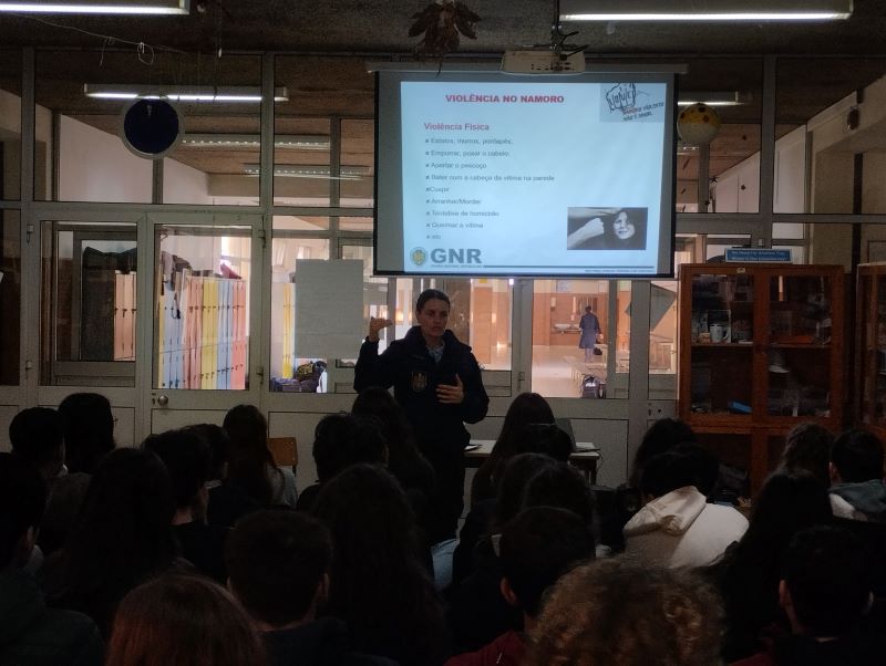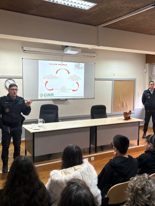Neste sentido, tendo consciência de que o combate a este flagelo social se revela de extrema importância, no âmbito do Projeto de Promoção e Educação para a Saúde (projeto PES) em articulação com o com o projeto Erasmus+ SEL- Harmony, nos dias 10 e 12 de fevereiro, todas as turmas do 8º ano do nosso Agrupamento participaram na sessão de sensibilização “Violência no namoro” dada pela Equipa da Escola Segura da GNR do Destacamento Territorial de Barcelos Braga.